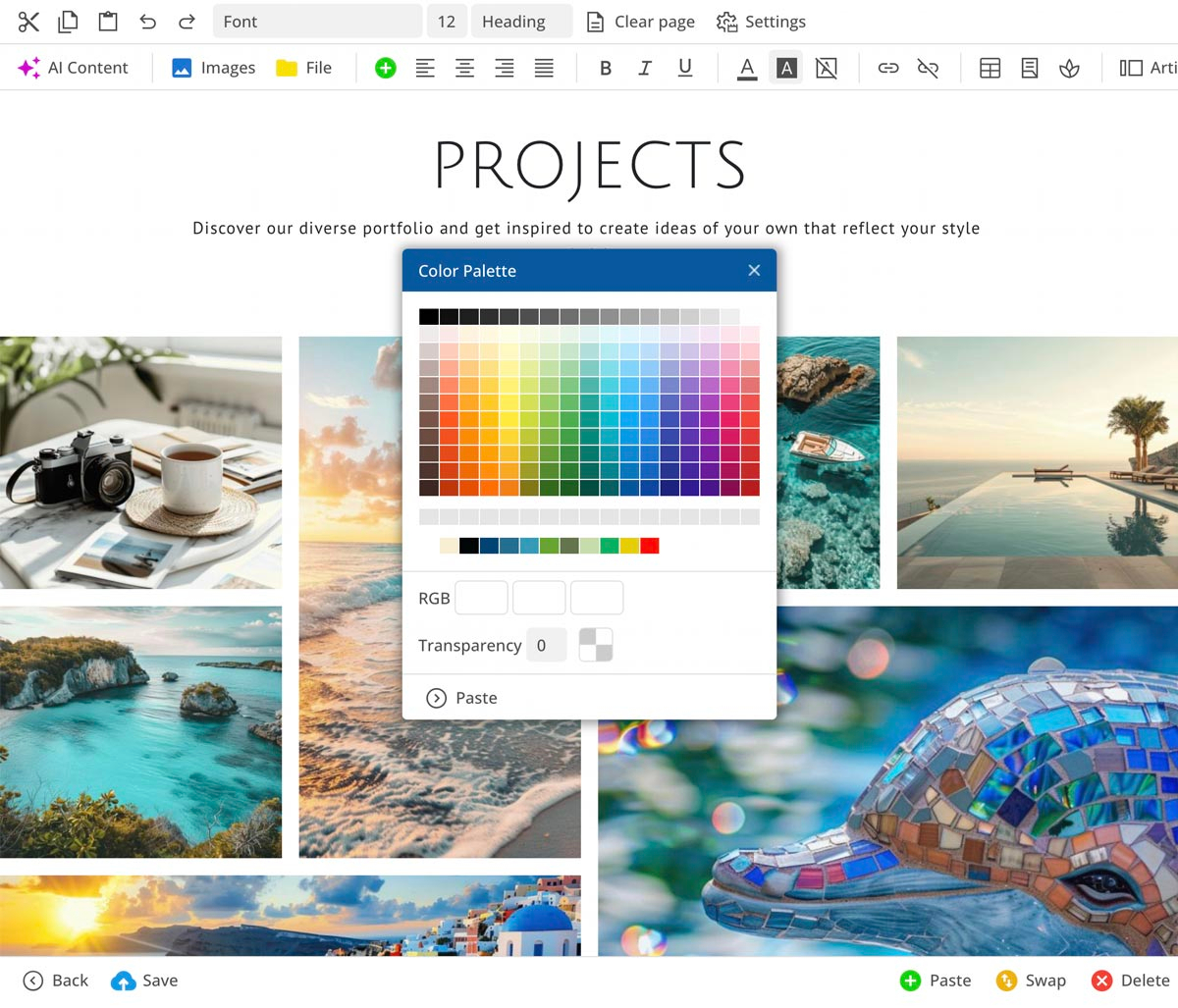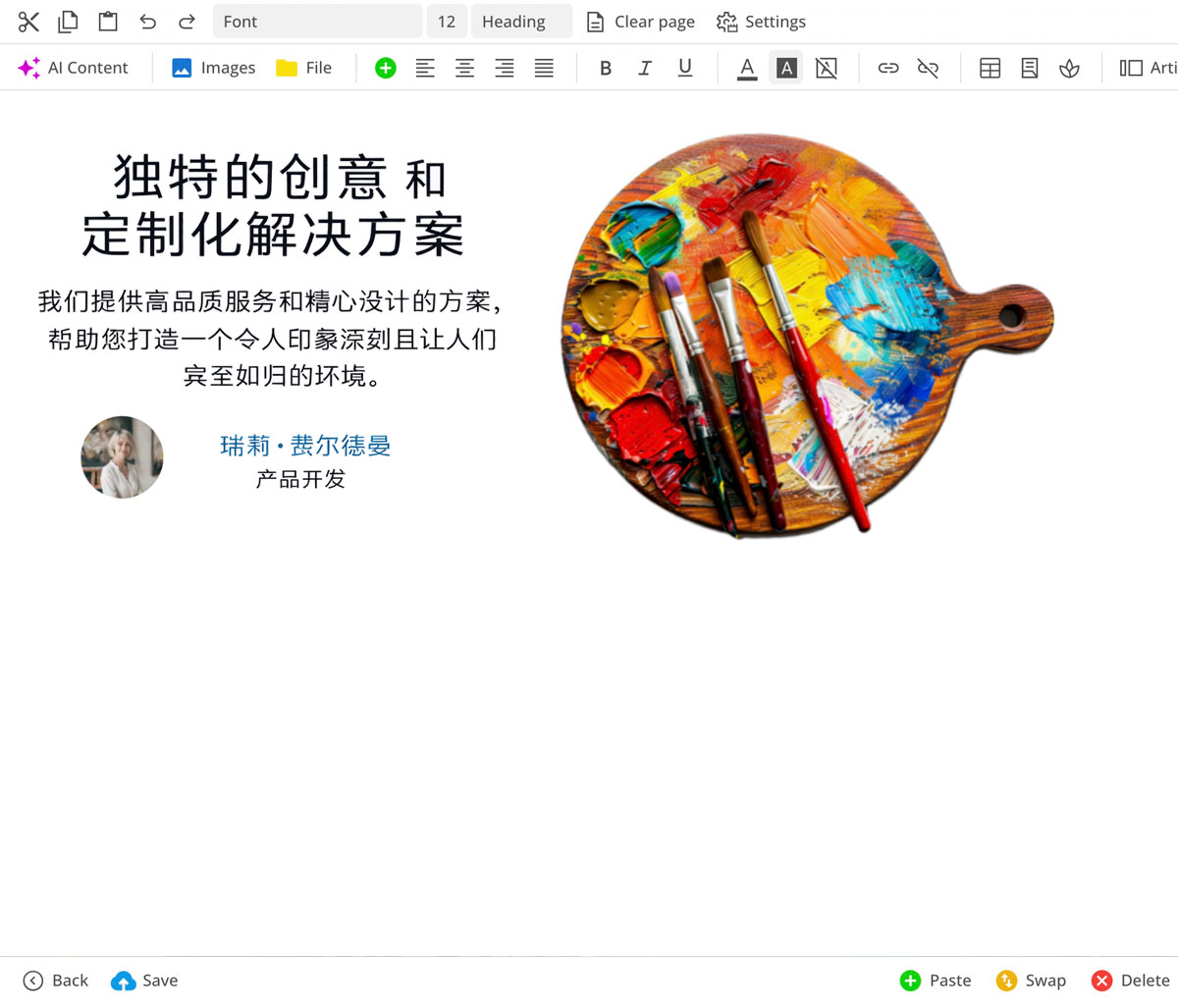 يوفر لك المحرر نماذج لقطاعات الصفحات المختلفة، المخصصة تمامًا للتصميم المختار. تساعدك ذكاء اصطناعي مدمج في توليد وتحسين النصوص.