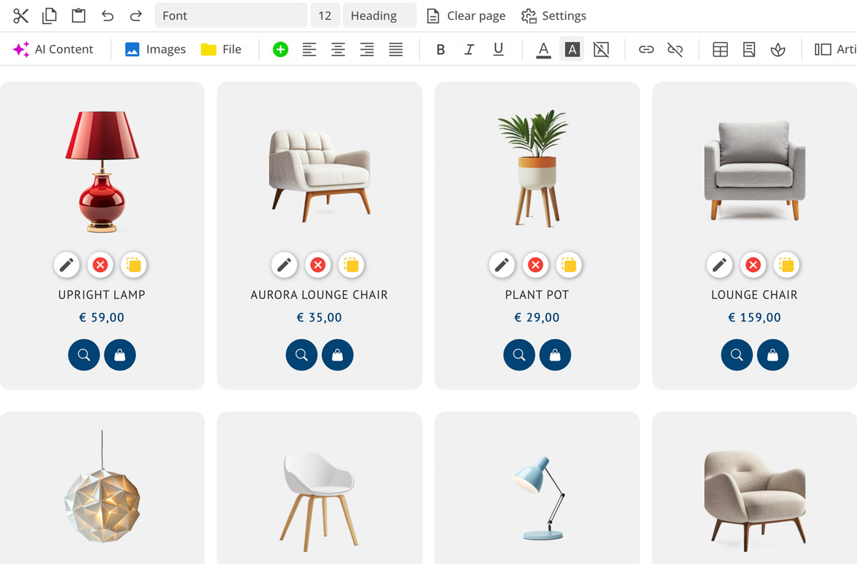 يمكن استيراد قوائم المنتجات وتخصيص الصور تلقائيًا. يمكن أيضًا ترجمة المتجر الإلكتروني بمساعدة الذكاء الاصطناعي إلى ما يصل إلى 24 لغة.