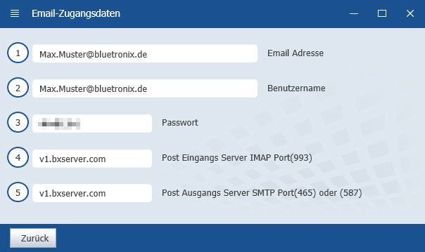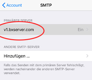 Tippen Sie auf Einstellungen Passwörter & Accounts bluetronix Mail Account (...Ihre Email-Adresse...) SMTP ...bxserver.com.